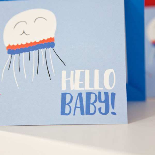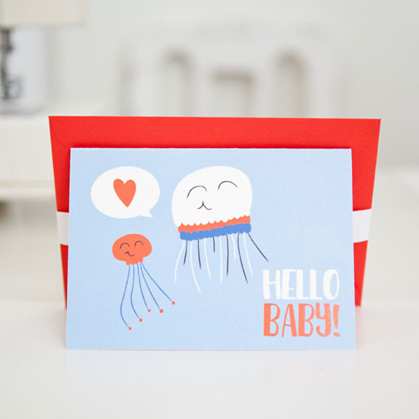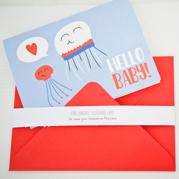 Hurra, das Baby ist da! Zu diesem Anlass möchte man natürlich gratulieren, und das am besten mit einer besonders liebevoll illustrieren Karte! Wie zum Beispiel der fröhlichen Klappkarte Qualle von Katrin. Darauf kuscheln sich Mamaqualle und Babyqualle zusammen und freuen sich wie wild über die Geburt eines neuen Menschenbabys. Diese süße Karte kommt mit einem Kuvert zu dir und es gibt sie sowohl für Jungen als auch für Mädchen. So macht das zur Geburt gratulieren gleich noch mehr Spaß! Eine nette kleine Aufmerksamkeit für alle frischgebackenen Eltern.