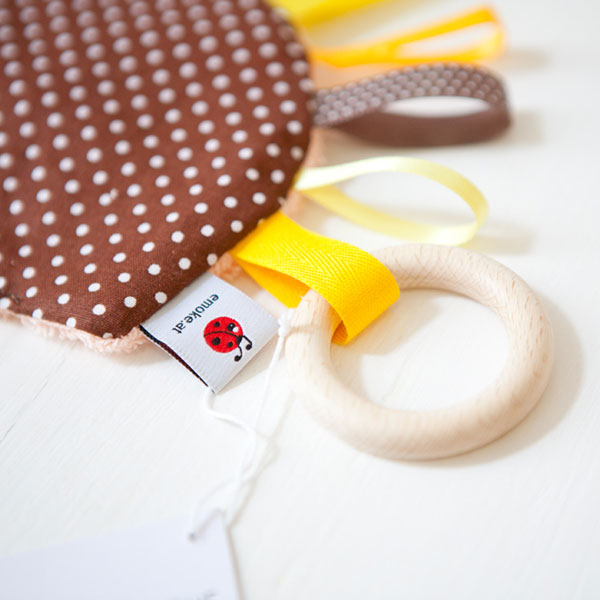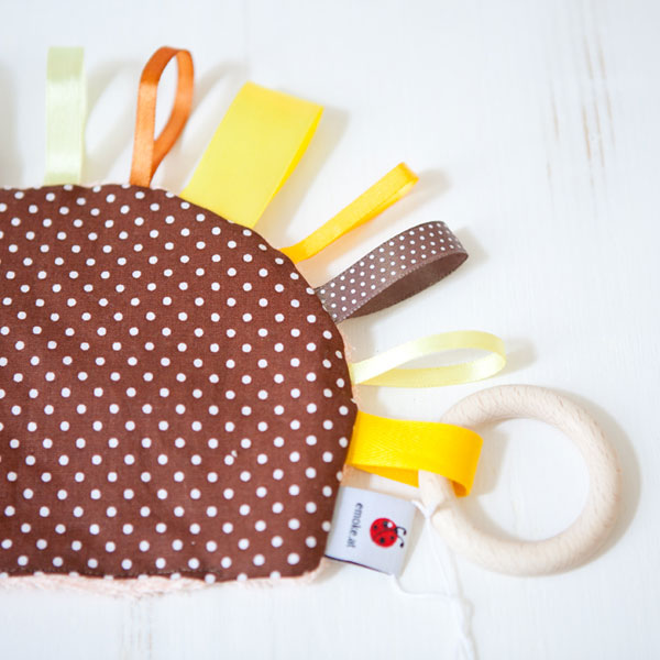 Unser Knistertuch Igel gelb & braun wird, wie all unsere Baby und Kinderartikel, in liebevoller Handarbeit gefertigt. Es ist nicht nur super kuschelig, sondern knistert auch ganz wunderbar beim Angreifen. Die bunten Schleifen am Rücken eignen sich perfekt zum Spielen und in den Holzring kann man super reinbeißen, sobald das Baby seine ersten Zähne bekommt!