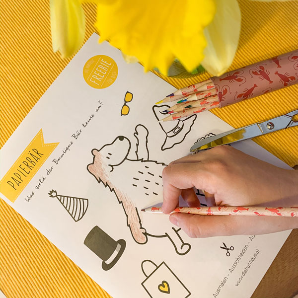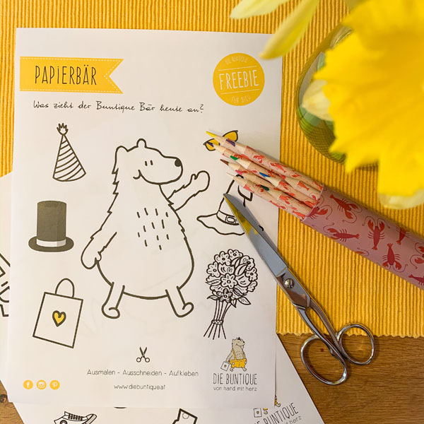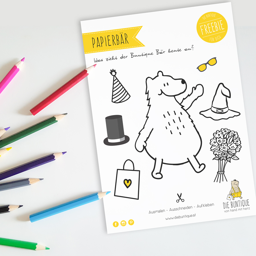 „Bunt, bunt, bunt sind alle meine Kleider“, das ist eines der Lieblingslieder unseres Buntique Bären! Aber Katrin von luftlinie hat beim Gestalten die Farbstifte leider nicht gefunden. Jetzt seid also ihr an der Reihe, den Papierbär und seine Kleidungsstücke auszumalen, auszuschneiden, eure Lieblingskombination auszusuchen und dann zusammen zu kleben!