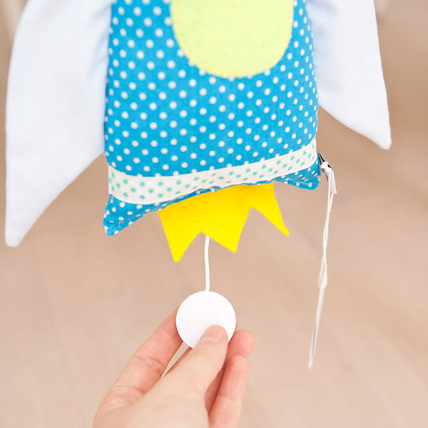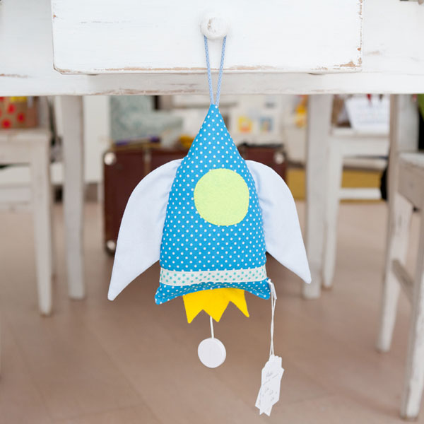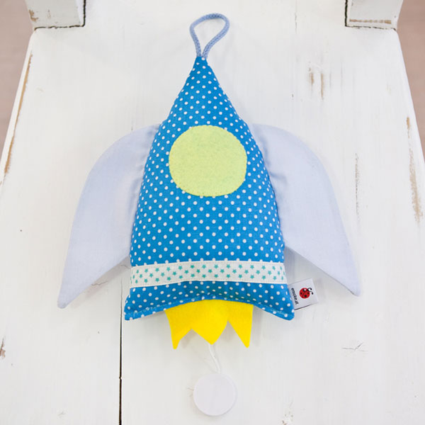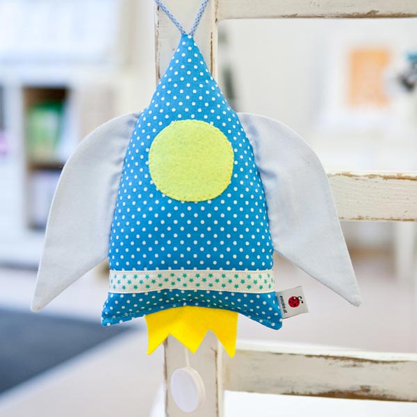Wir nähen all unsere Spieluhren, wie auch die Spieluhr Rakete in liebevoller Handarbeit. Sie werden sorgfältig von Hand geschnitten, genäht, bestickt und mit Bio-Schafwolle gefüllt. So ist jede ein Einzelstück und etwas ganz Besonderes. Die außergewöhnliche Spieluhr Rakete spielt die Melodie: „„La Le Lu““.