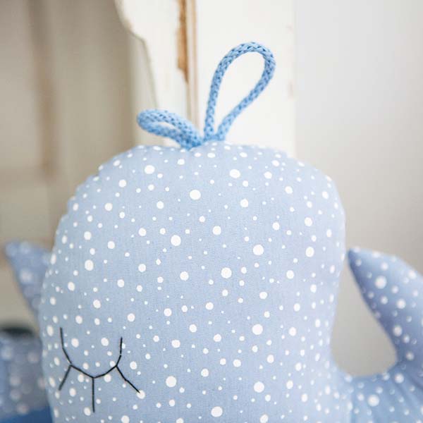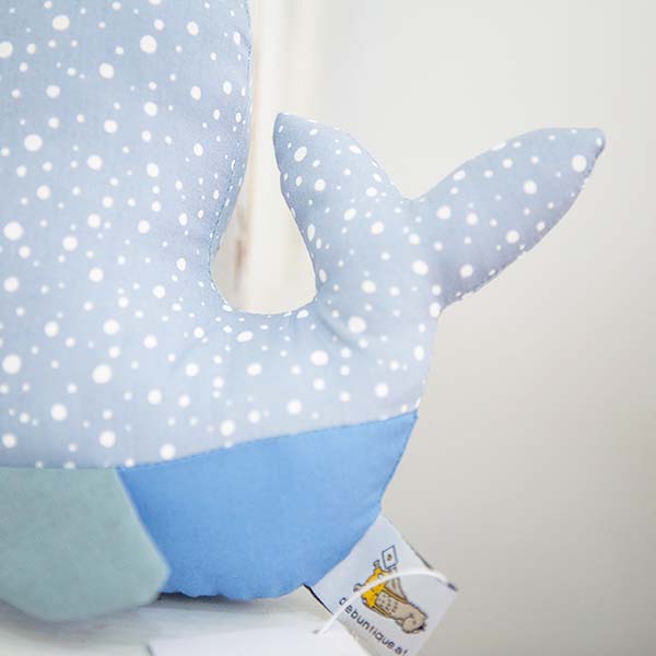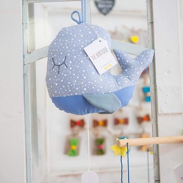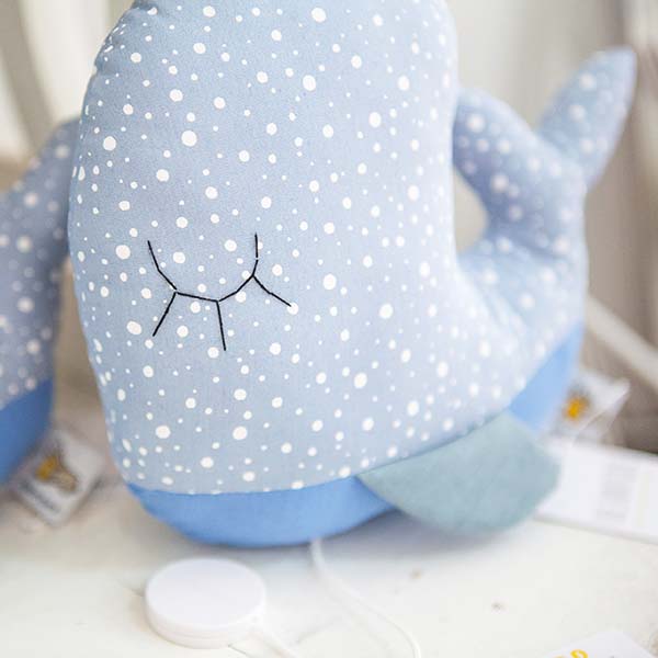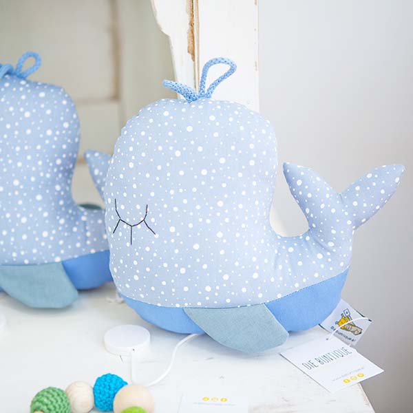 Wir nähen all unsere Spieluhren, wie auch die Spieluhr Wal in liebevoller Handarbeit. Sie werden sorgfältig von Hand geschnitten, genäht, bestickt und mit Füllwatte gefüllt. So ist jede ein Einzelstück und etwas ganz Besonderes. Die außergewöhnliche Spieluhr Wal spielt die Melodie: „Sandmännchen“.