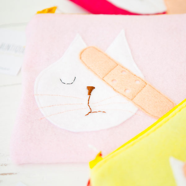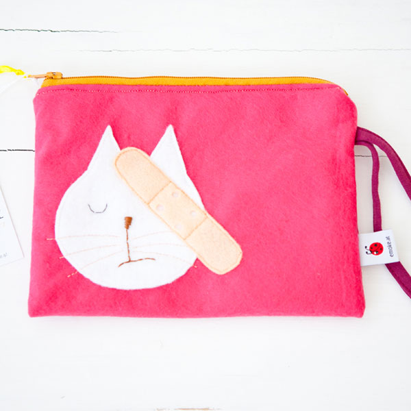 Unser Miau Weh Täschchen mit Zipp ist ein besonders nützlicher Begleiter im Alltag. Es wird wie alle unsere Täschchen von Emöke aus Filz und Baumwolle von Hand gefertigt und ist durch seine liebevollen Details und verspielten Look etwas ganz Besonderes. Es ist besonders praktisch für unterwegs und bietet genug Platz für Pflaster, Notfalltropfen, Creme, Kosmetika und jedes nur erdenklichen Erste Hilfe Utensil. Da hat man im Bedarfsfall immer etwas dabei! Egal ob auf dem Schulweg oder auf Reisen!